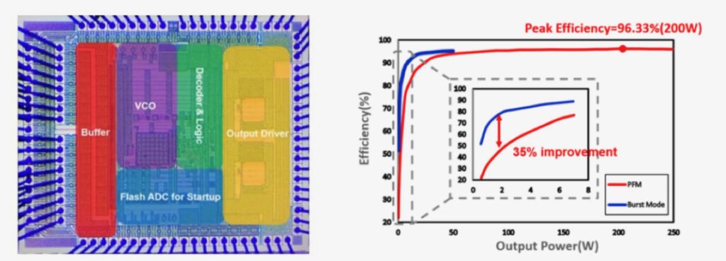 此外,在近期最夯的AI伺服器議題上,半導體所與陽明交通大學的陳柏宏教授研究團隊、中央大學的杜長慶教授研究團隊展開跨校合作,成功設計出整合 Burst Mode 與 Soft-Start 功能的 LLC 控制器架構(圖三)。在Burst Mode 控制下,於輕載時可減少開關損耗,提升待機效率;於Soft-Start 可平滑啟動系統,避免大電流衝擊元件。並採用 ZCS(零電流切換)控制技術,減少 EMI 與能量損耗,展現集團在智慧電源控制領域創新能量。