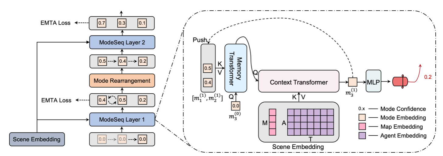 CVPR是人工智慧與計算機視覺領域最具有影響力的國際學術會議,每年吸引頂尖科技企業、研究機構以及學術界高手參與。鴻海研究院團隊已於今年 6月13日在會議上發表多模態軌跡預測模型ModeSeq。該技術專注於多模態軌跡預測,解決過去方法對於預測多種可能軌跡的困難,在保持高性能的同時獲得多樣性的預測。 ModeSeq提出的方法,是使用順序模式建模並設計Early-Match-Take-All (EMTA)損失函數來增強多模態軌跡預測。 ModeSeq使用因式分解變換器(Factorized Transformers)進行場景編碼,並使用結合記憶變換器與因式分解變換器模組ModeSeq層的解碼器。