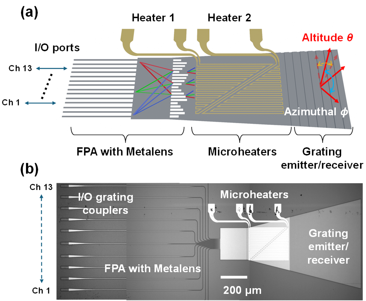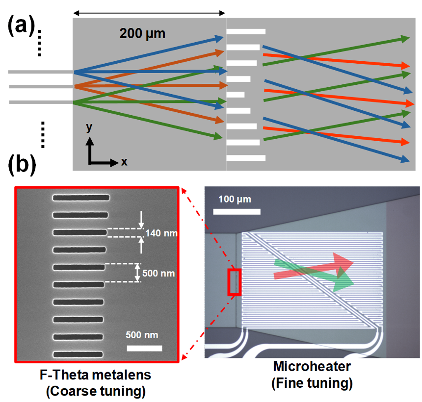 二維矽光子-超穎透鏡焦平面陣列光束轉向技術結合矽光子積體光學技術與超穎透鏡(meta-lens)結構,能在晶片上實現高速、低功耗且高精度的光束控制。透過焦平面陣列動態調變相位分佈,可實現二維光束掃描與即時轉向,應用於光學雷達(LiDAR)、3D成像及光通訊中,展現高整合度與可量產化優勢。