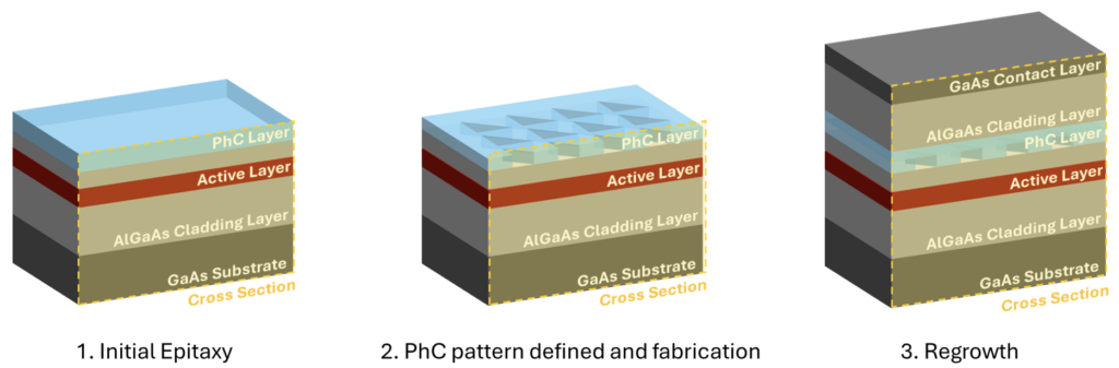 圖一、PhCSEL製造流程示意圖:(1)初始磊晶生長底層結構和有源層,(2)光子晶體圖案定義與製作,(3)再生長工藝形成完整雷射結構。此埋入式設計使光波在二維光子晶體中形成零群速度效應,實現低發散角輸出。
