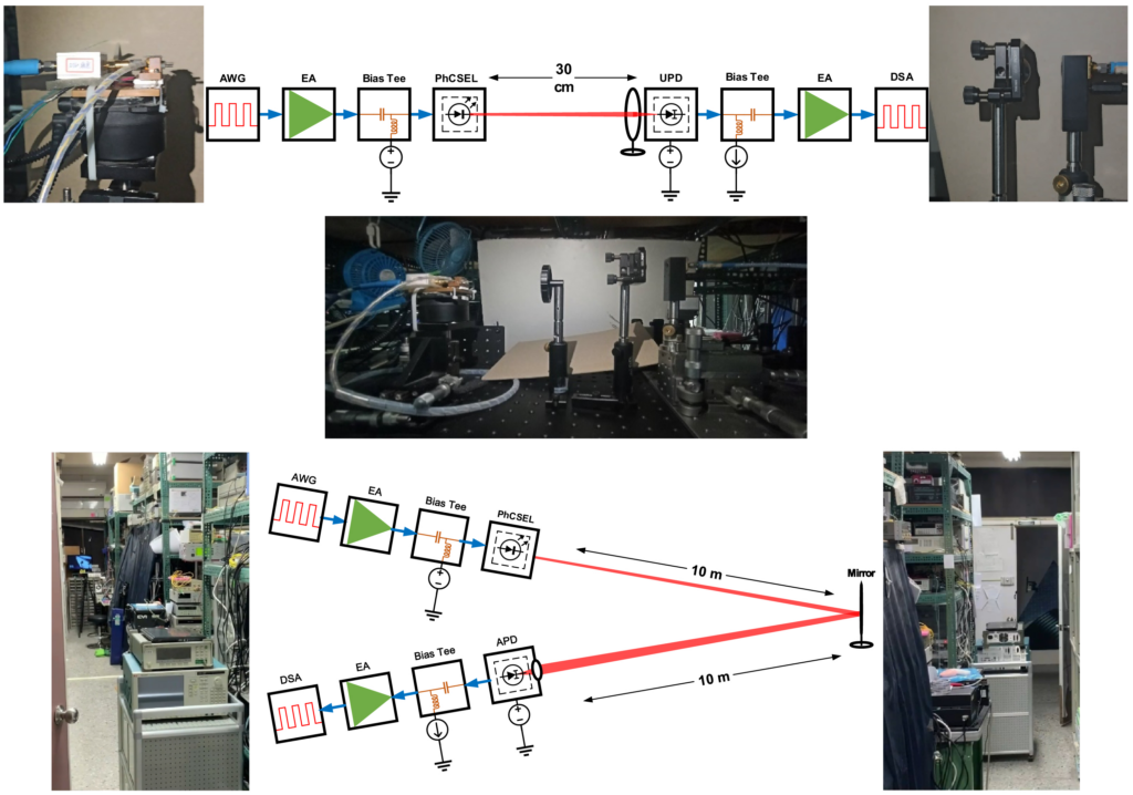 圖二、無透鏡自由空間光傳輸系統實驗配置:上方為0.3公尺短距離傳輸配置,下方為使用反射鏡實現的20公尺長距離傳輸配置。PhCSEL無需使用傳統透鏡準直系統即可實現高速數據傳輸,大幅簡化了系統複雜度。